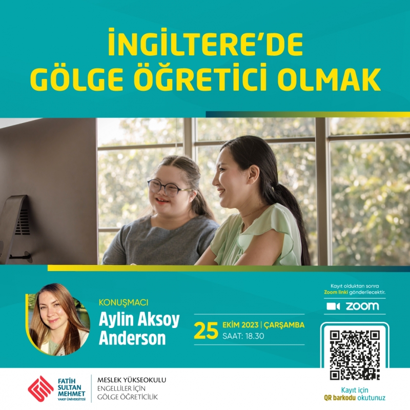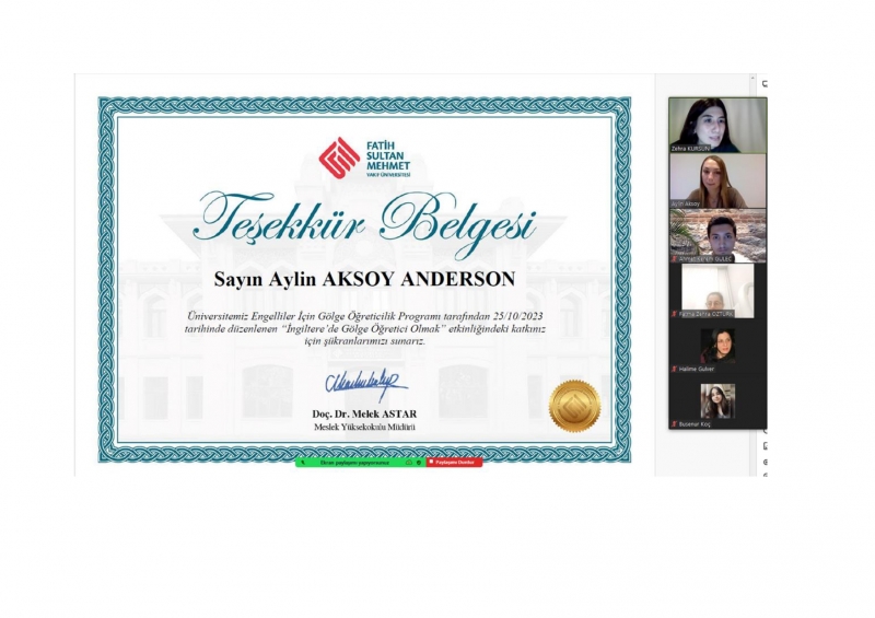 Engelliler İçin Gölge Öğreticilik Programı tarafından düzenlenen ve 25.10.2023 tarihinde yapılan İngiltere’de Gölge Öğretici Olmak başlıklı seminer çevrimiçi ortamda gerçekleştirildi. Seminerde Aylin Aksoy Anderson gölge öğreticiliğin İngiltere’deki tarihsel sürecini, gölge öğretici olmanın zorluklarını kendi deneyimlerinden yola çıkarak öğrencilerimizle paylaştı. Seminere öğrencilerin sorularının cevaplanması ve Aylin Aksoy Anderson’a teşekkür belgesinin takdim edilmesi ile sona erdi.